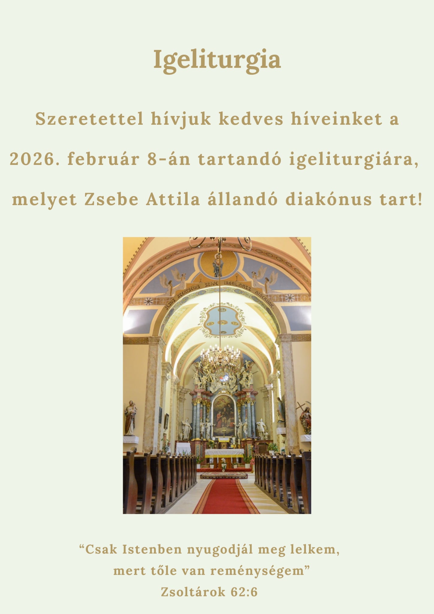 Szeretettel várjuk híveinket február 8-án tartandó igeliturgiára ,melyet Zsebe Attila állandó diakónus fog tartani.