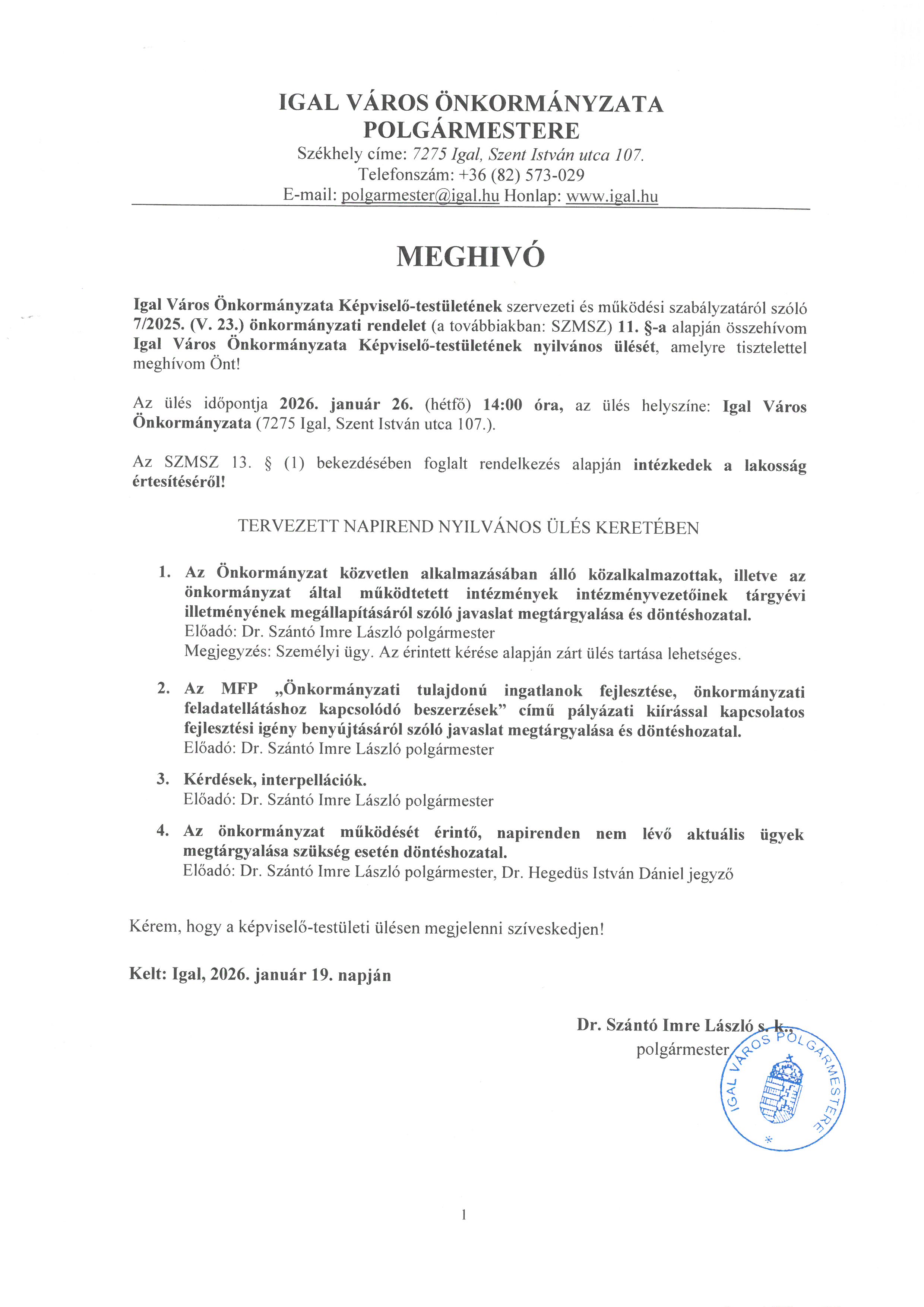 Az ülés időpontja 2026. január 26. (hétfő) 14:00 óra, az ülés helyszíne: Igal Város Önkormányzata (7275 Igal, Szent István utca 107.).