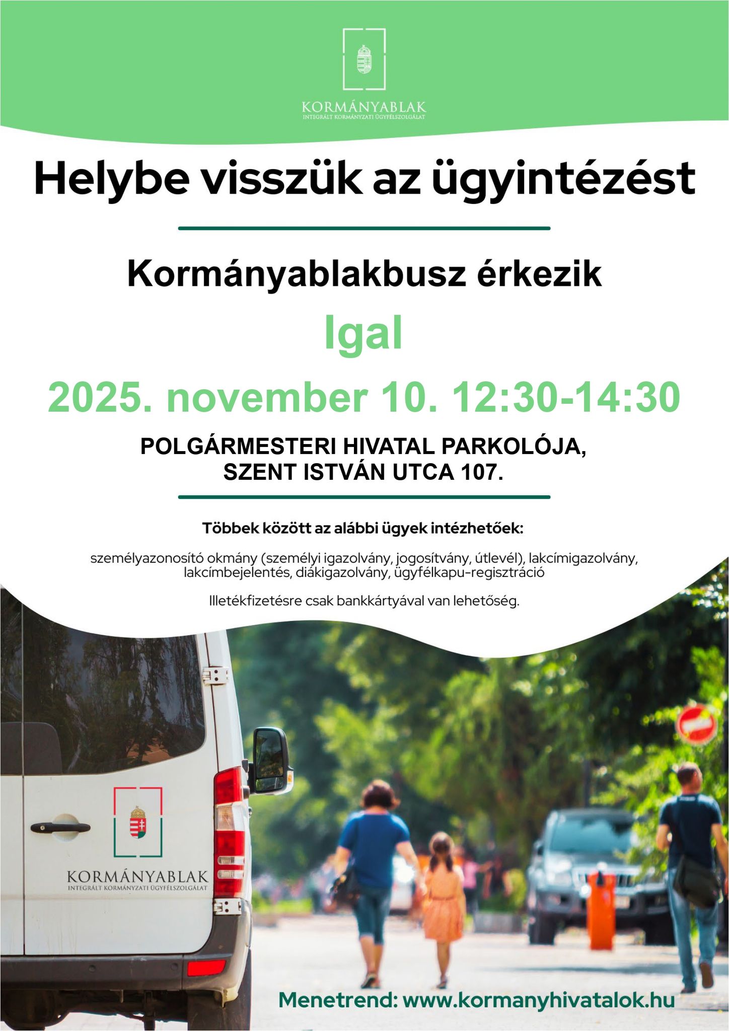 Kormányablakbusz érkezik Igalba, 2025. november 10-én, ügyet intézni 12:30-14:30 óra között lehet.