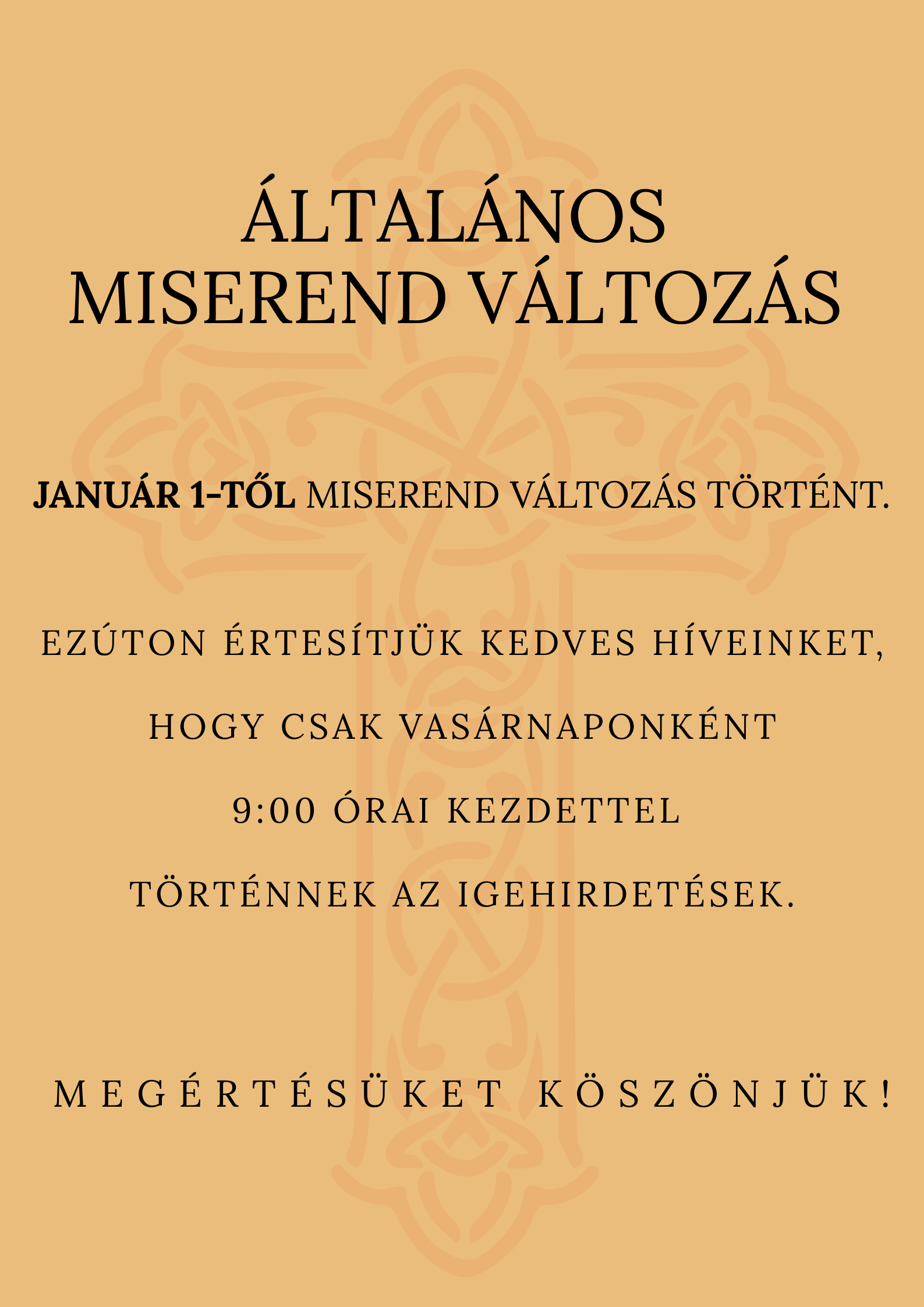 Értesítjük híveinket, hogy január 1-től miserend változás történt! Ezúton értesítjük kedves híveinket, hogy csak vasárnaponként 9:00 órai kezdettel történnek az igehirdetések. Megértésüket Köszönjük!
