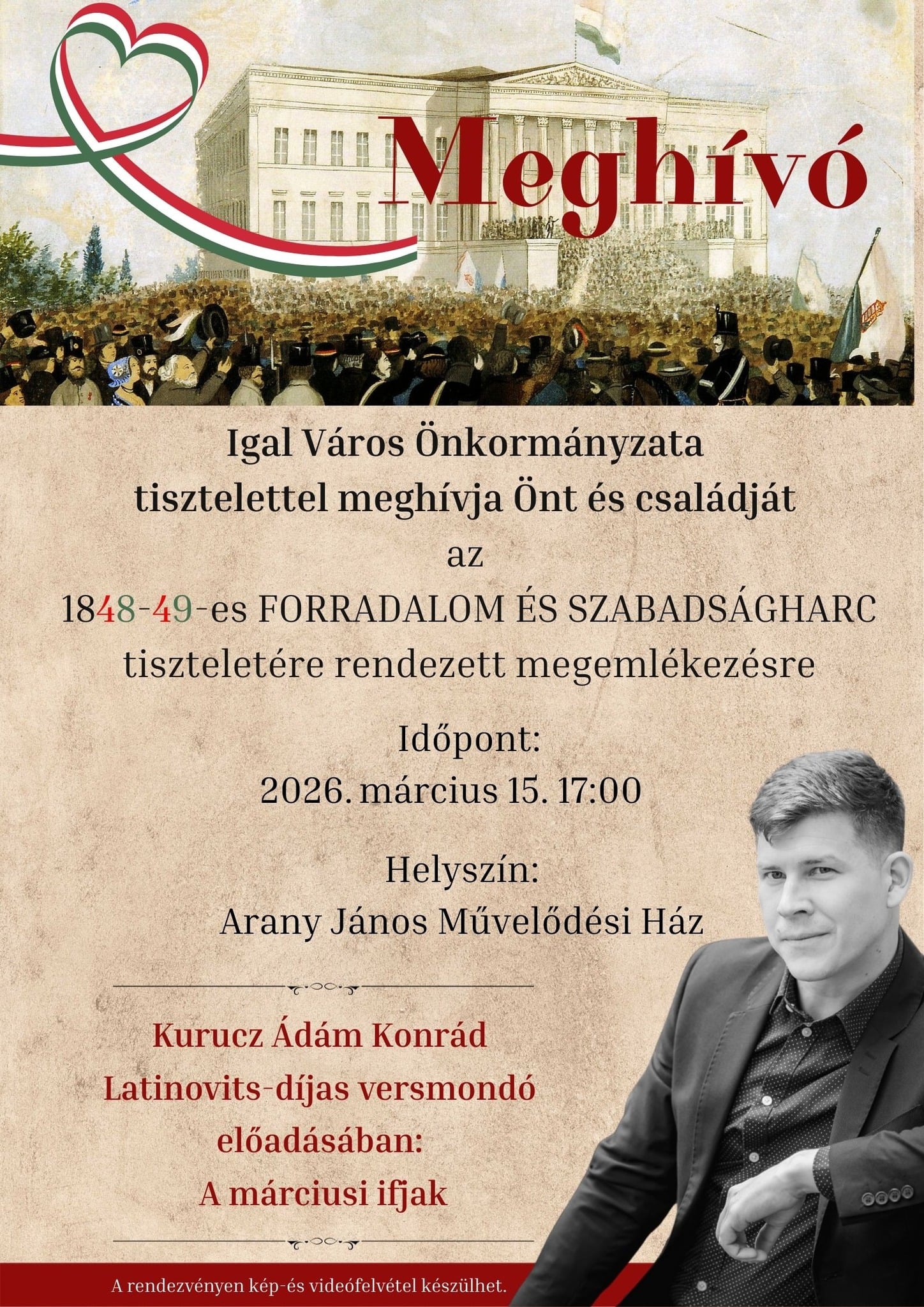 Igal Város Önkormányzata tisztelettel meghívja a város lakóit és minden érdeklődőt az 1848–49-es forradalom és szabadságharc tiszteletére rendezett ünnepi megemlékezésre.
